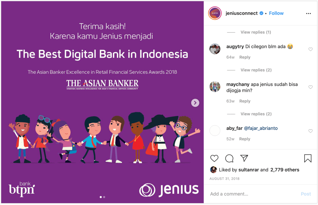 Nowadays, almost all traditional business have disrupted by digital technology, including banking. Branchless banking is a new trend which has many advantages than the conventional ones, for example, less cost since they don’t need opening physical bank. For customers, it is a more convenient way of opening an account with just a smartphone. But, the main issue with this branchless banking is about trust, which the conventional bank has most. In Jenius case, it is a coincidence that Jenius backed by the traditional bank, so the trust issue doesn’t be a problem. But, how about the new player who doesn’t have any support from conventional banking build its trust? What do you think?